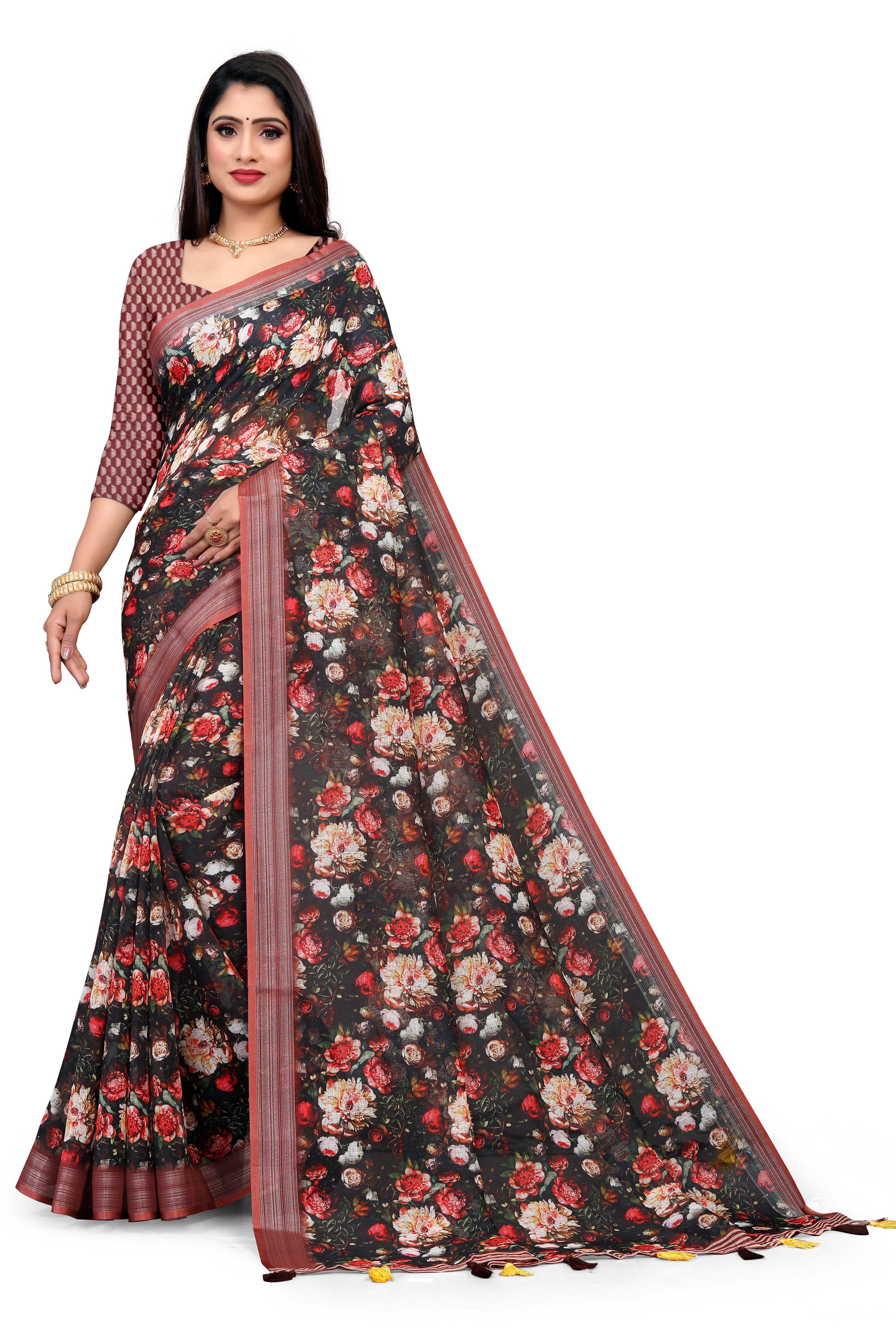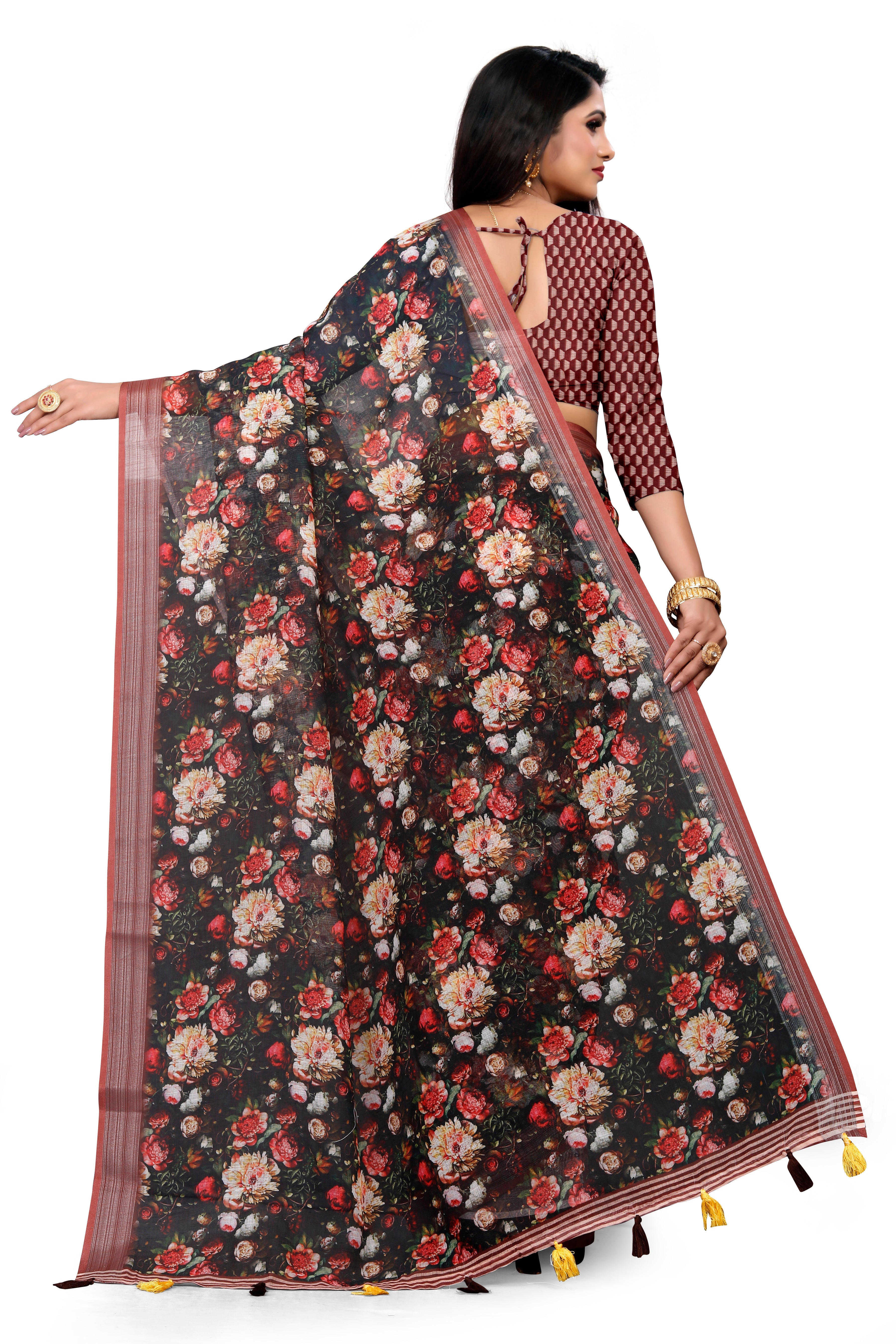 Turn heads in this elegant Black Linen Saree adorned with a romantic vintage floral digital print. The saree is finished with a refined wevon jari border and delicate tassels on the pallu, striking the perfect balance between timeless grace and modern charm.