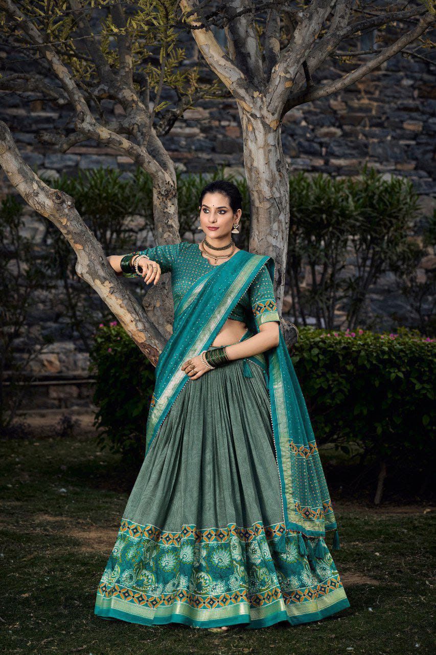 • Teal Green Tussar Silk Lehenga with Floral Foil Print & Embroidered Dupatta