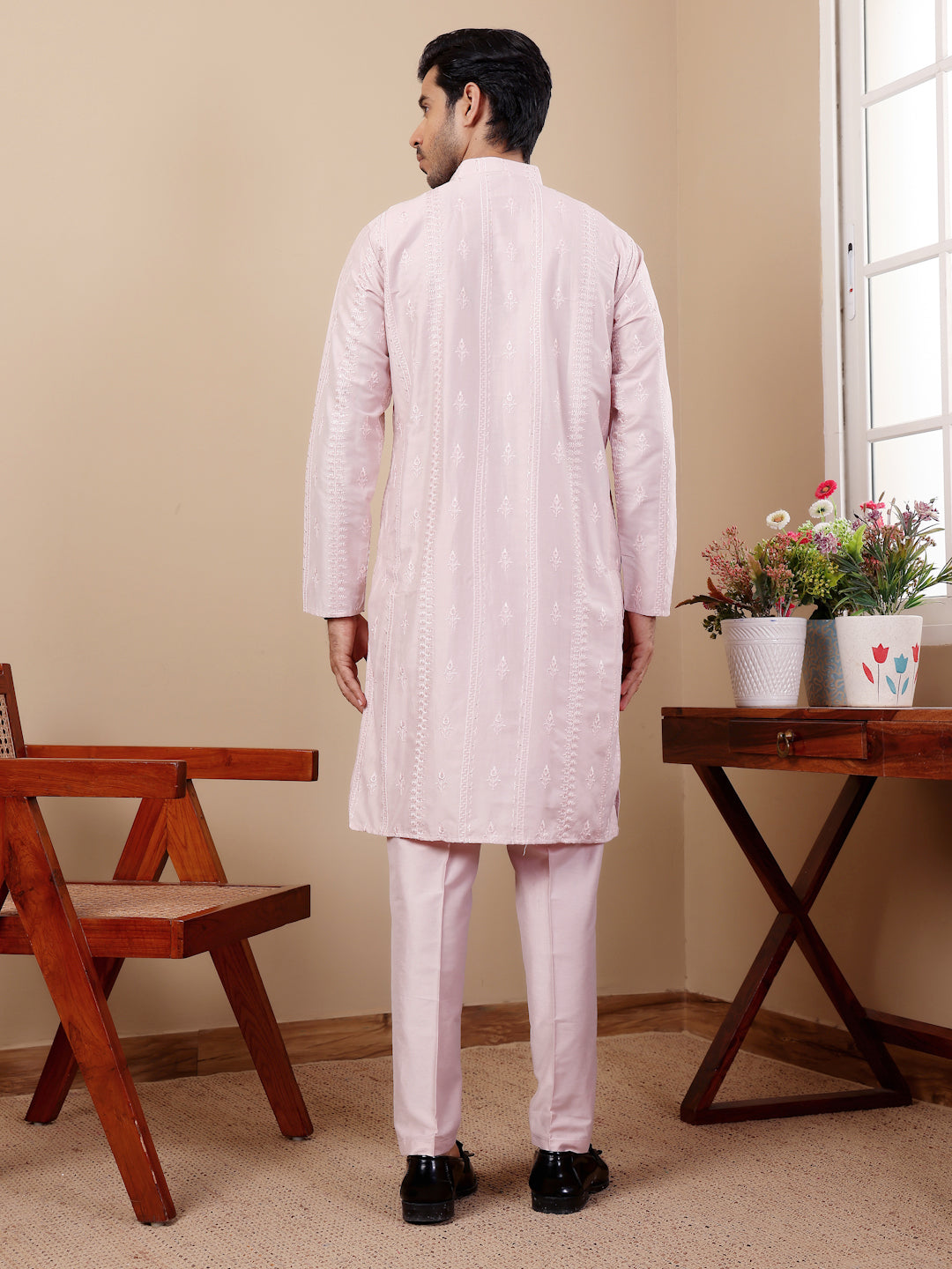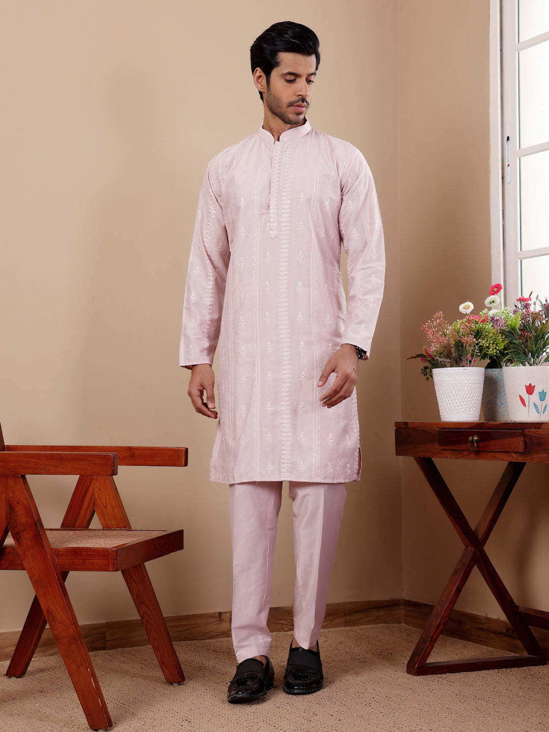 Elegant Light Pink Chikankari Kurta Pajama Set for Men – Festive & Wedding Wear Elegant Light Pink Chikankari Kurta Pajama Set for Men – Festive & Wedding Wear